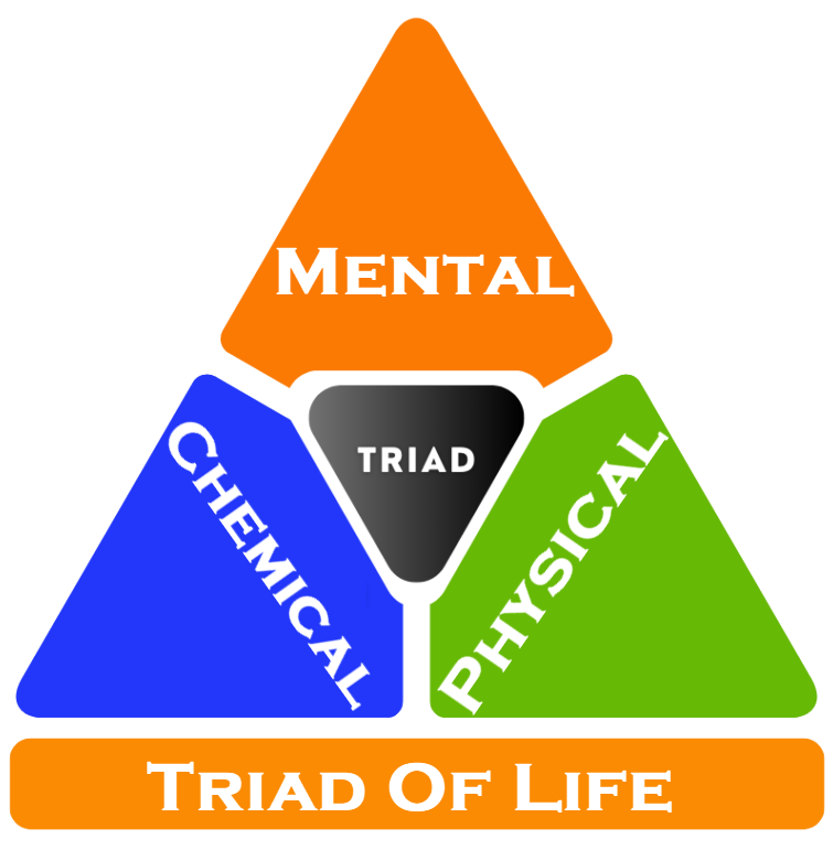 The Triad of Life is fun and useful guide to your holistic Health-not just lack of disease or symptoms, but an exalted state of the highest, most perfect physical, chemical and spiritual function. The checklist within helps us manage the essential requirements of life, and gives us something to strive for. There are three sides to the triangle: Physical, Chemical and Mental. They are all interlinked; each side supports and affects the other two. Although you cannot stay alive without all three, of foremost importance is the physical, without which there would be no life form called You. You, as a conscious, living creature have the power to influence all three sides of the Triad. Here are my recommendations: